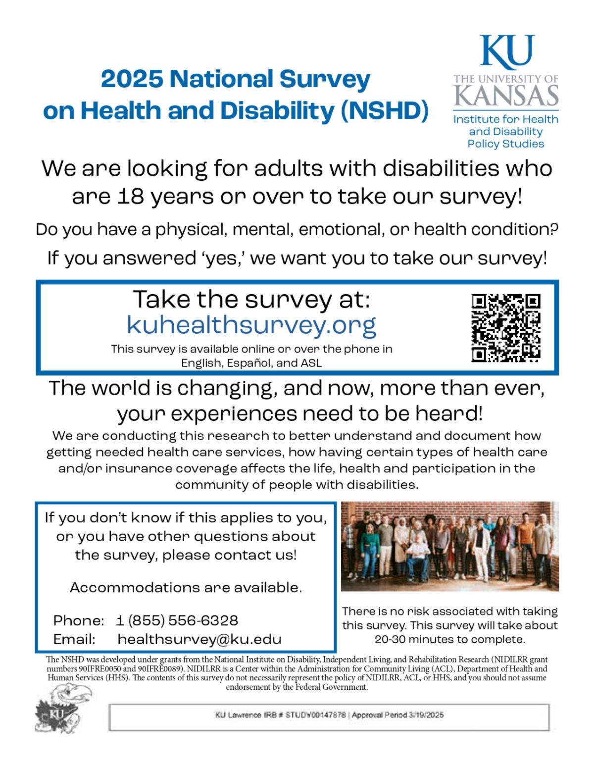 University of Kansas's Institute for Health and Disability Policy Studies, in partnership with the Community Living Policy Center at the Lurie Institute, is looking for adults with disabilities who are 18 years or over to take their survey.