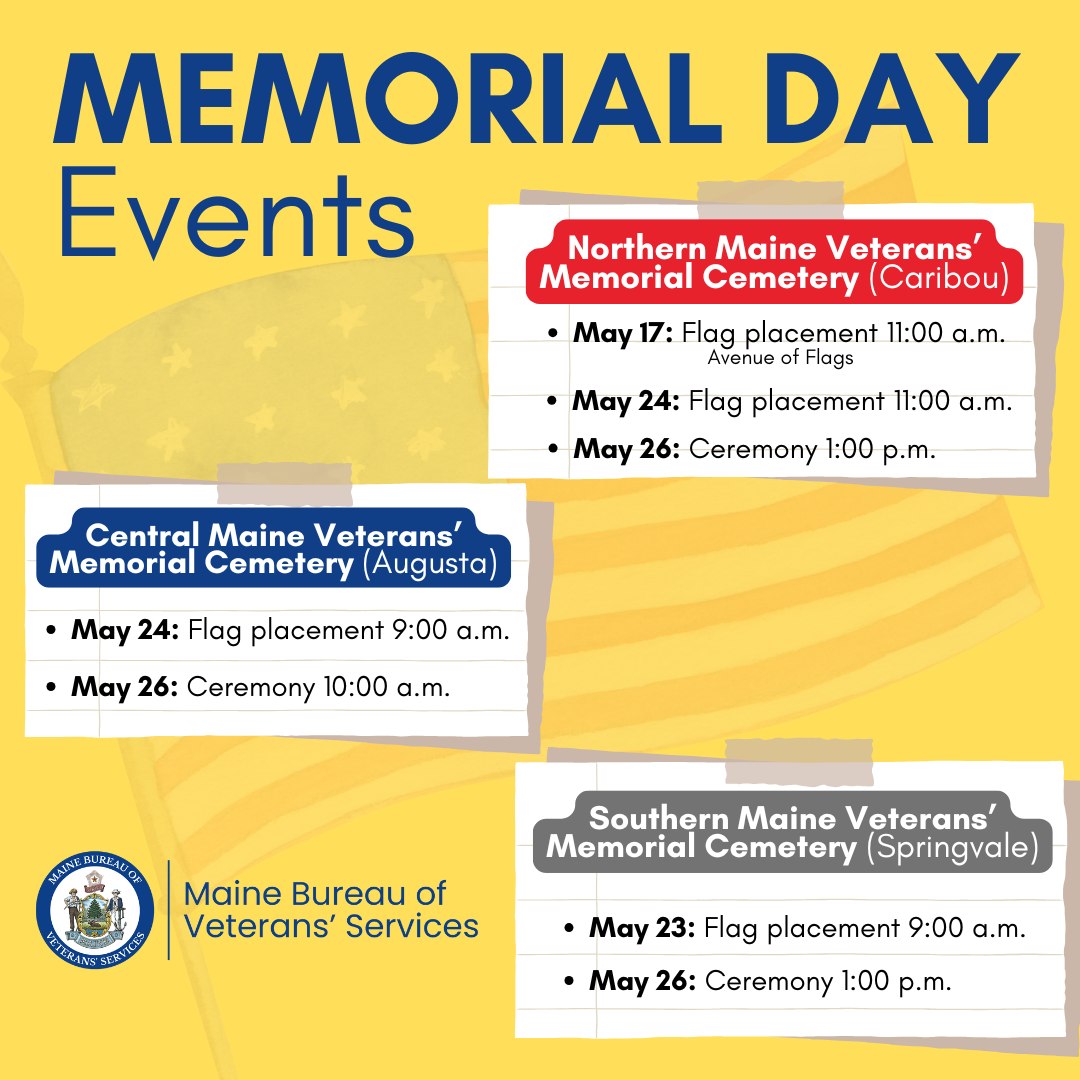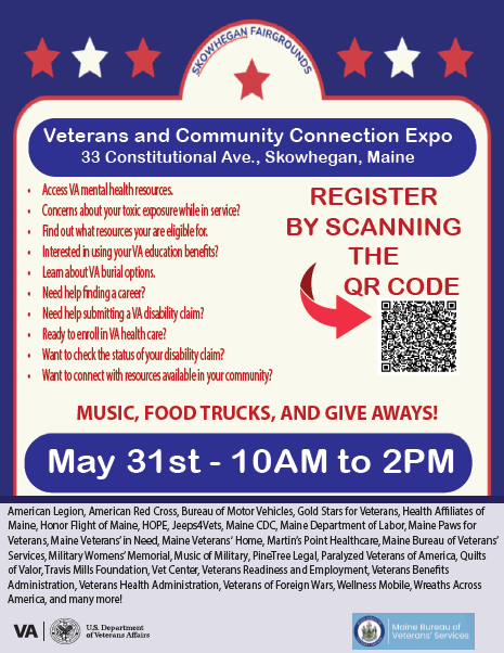 May 31 - Veterans, Service Members, and Family Expo at the Skowhegan Fairgrounds. 10:00 a.m. to 2:00 p.m. Music, food trucks, and activities. Federal, State, and local resources will be on-hand.