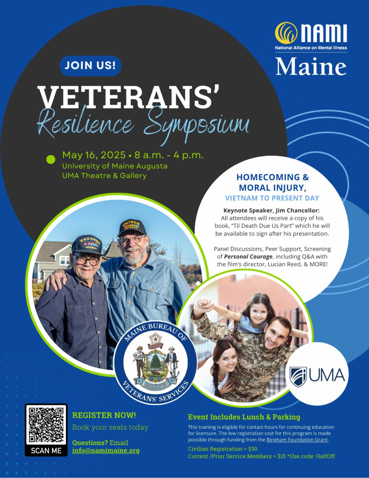 May 16 - Veterans' Resilience Symposium, Homecoming & Moral Injury. 8:00 a.m. to 4:00 p.m. Join NAMI Maine, Maine Bureau of Veterans' Services, and the University of Maine at Augusta for a powerful day of conversation, healing, and community — featuring keynote speaker Jim Chancellor, panel discussions, a film screening, and more. To register, visit https://tinyurl.com/3cjajt2v