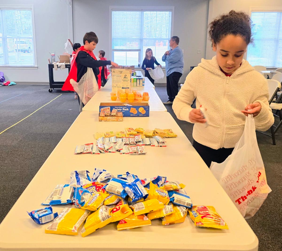 The 3rd–5th grade students in Wright’s Chapel’s Afterschool Program have been hard at work this school year, assembling weekend food bags for children in our community. Each month, they prepare 50 bags for elementary students facing food insecurity, providing two days’ worth of shelf-stable breakfast, lunch, dinner, and snacks.