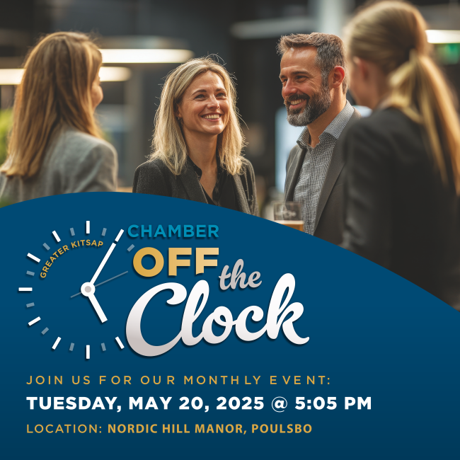 | | All are invited to join us for the Chamber's monthly networking night - Chamber: Off the Clock! This month we're headed back up to Poulsbo to enjoy the hospitality of KJ and Heinz Lange at Nordic Hill Manor. Sign up now to reserve your spot - $20 online or at the door covers sips and bites. Bring your business cards and have your elevator pitch ready for all the new connections you're sure to make! | | Highlight Your Business with Tabling Opportunity at Chamber Luncheon | | Insurance Needs for You & Your Employees: Business Health Trust Has You Covered | | |