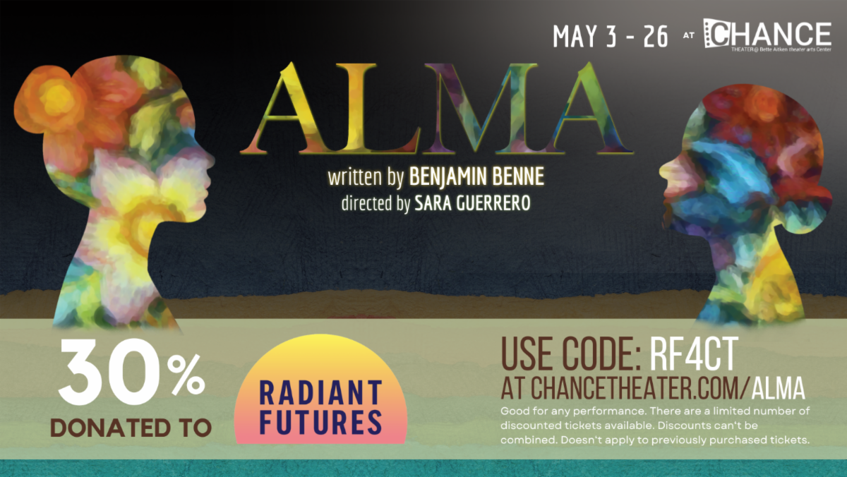 Come join us as we collaborate with the Chance Theater for their production of Alma. When you use promo code RF4CT, 30% of the ticket price will be donated to Radiant Futures.