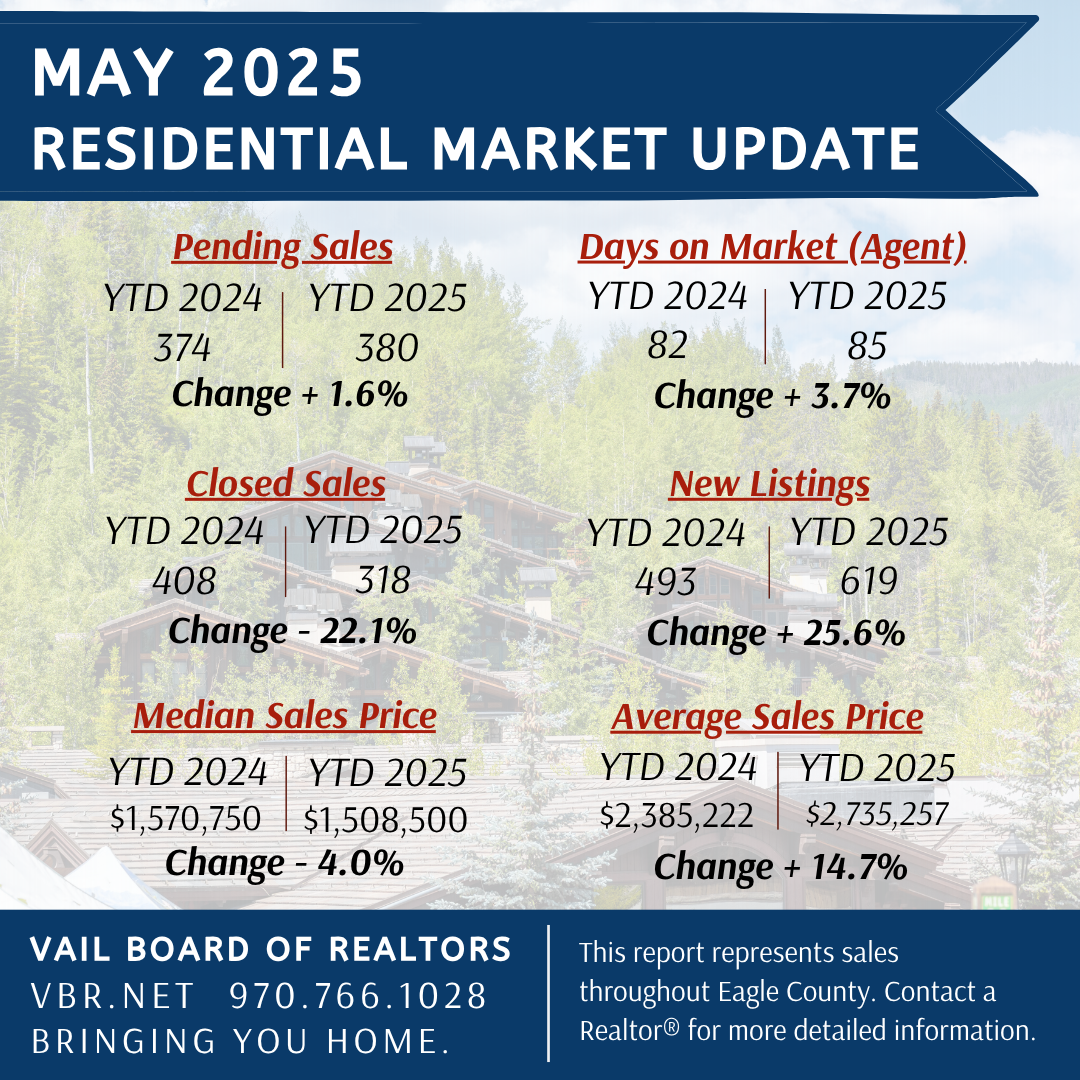 May 2025 market statistics are available for Eagle County residential real estate. Click here or the image below to see an overview of the market.