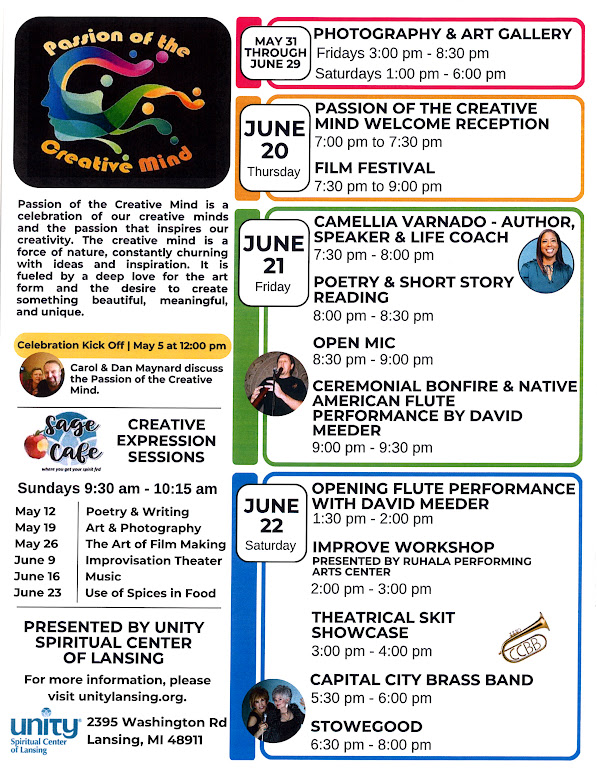 Unity of Lansing invites you to join in this festival of the Creative Mind. There are no tickets for any of the events which are educational as well as entertaining. Love offerings accepted.