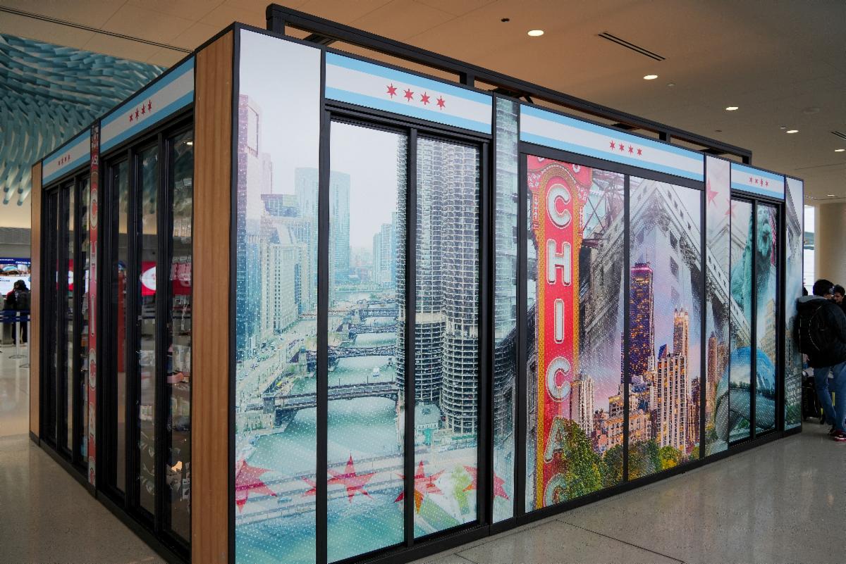 Adorned with a mural showcasing iconic views from downtown Chicago, the grab-and-go kiosk features wide aisles to accommodate passengers with disabilities as well as those traveling with luggage or strollers.