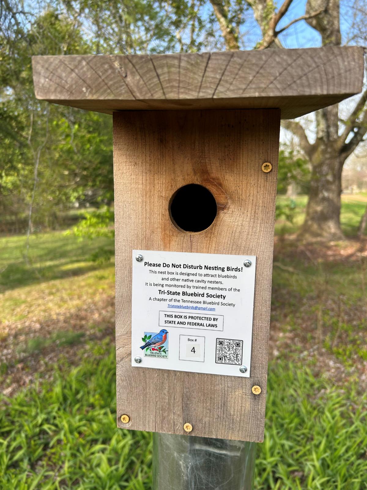The new nest box labels have a QR code for learning more about bluebirds. If you are interested in serving as a monitor of the boxes, call Alison Hoffmann 423-645-1642 or email