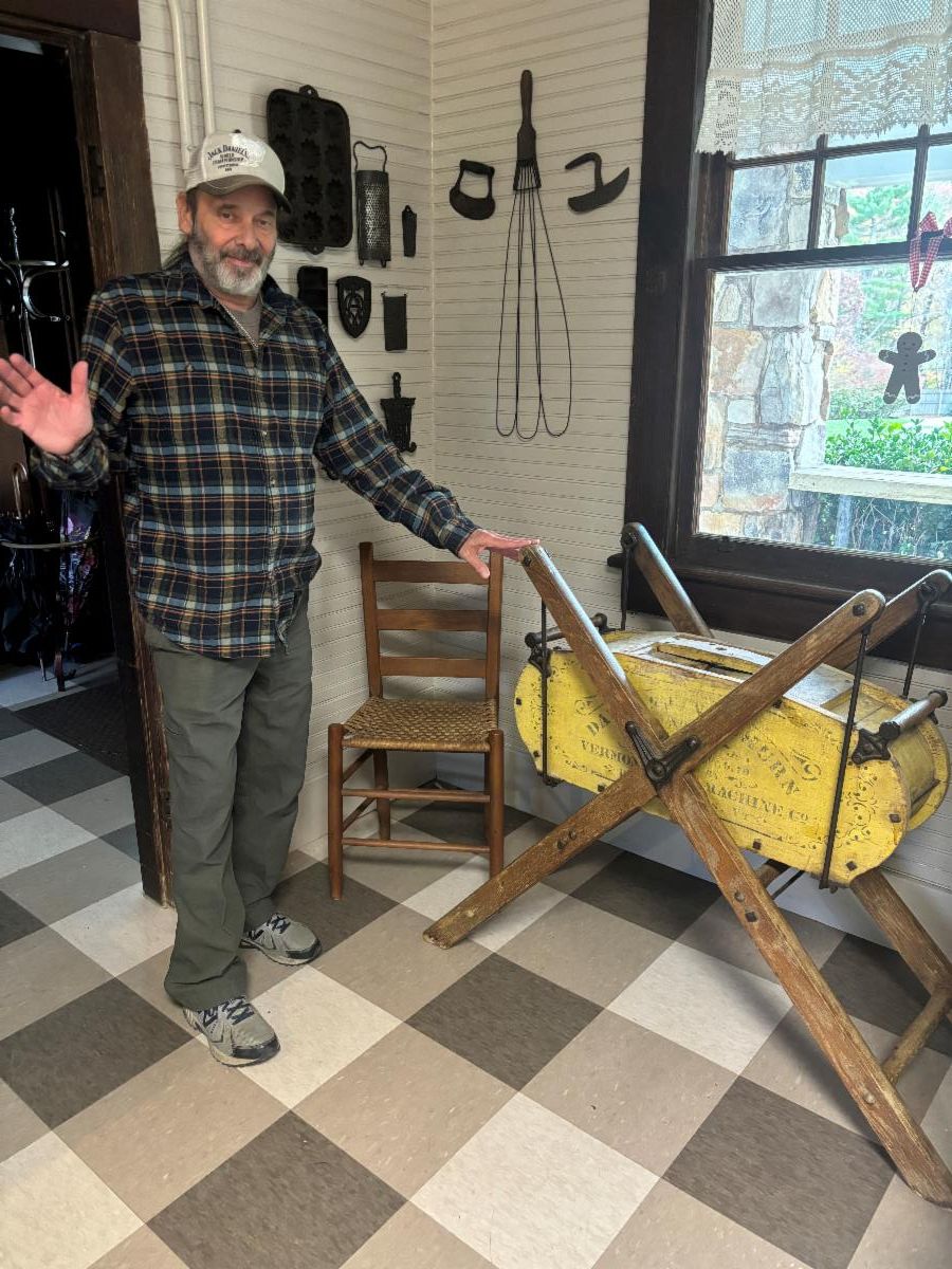 Bruce is shown here with the wooden swing butter churn which had been stored in the Bachman McCoy basement prior to being sold in the early 2000s. Additionally, he donated a maple ladder-back chair with an original woven twine seat. The chair belonged to Louisa Bowman, also a Freudenberg descendant.