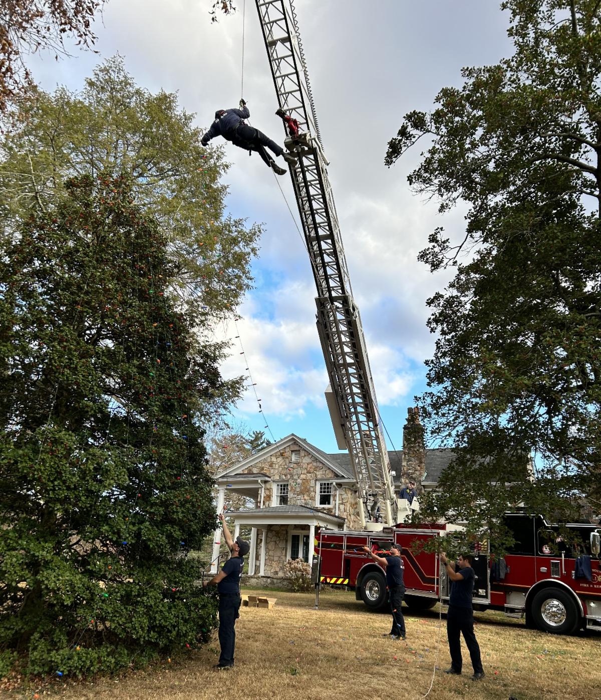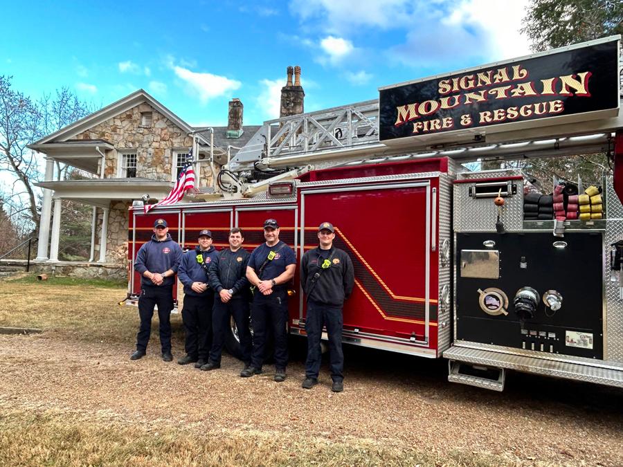 Thank you to Robert Clark, Brandon Spain, Russ Harwood, Matt Wildman, and Dylan Brock, left to right above, of the Signal Mountain Fire Department who hung the lights on the Christmas tree. They