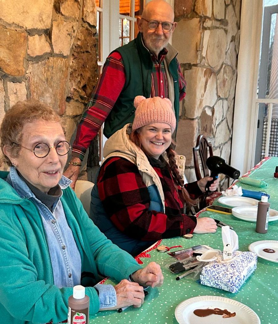 Juanita Tumelaire, Evie Durant, and Ted Tumelaire volunteered at the Keepsake Ornament Making Center helping young and old alike paint their wooden ornaments. Ted cut and sanded the wooden disks this fall, and Juanita and Evie turned our guests' painted fingerprints into reindeer faces. | |