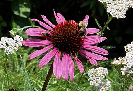 Almost everyone who visits McCoy Farm & Gardens finds many animals seem to enjoy the grounds. Of course, dogs of all types and sizes walk the trails or grounds, and birds abound -- over 130 species have been identified. Deer are particularly fond of the safety of the thickets and the meadows where they can find grass and apples in season. Raccoons, squirrels, chipmunks, groundhogs, snakes, birds, bees, and more call McCoy home. The black bear who visited last year became quite famous.