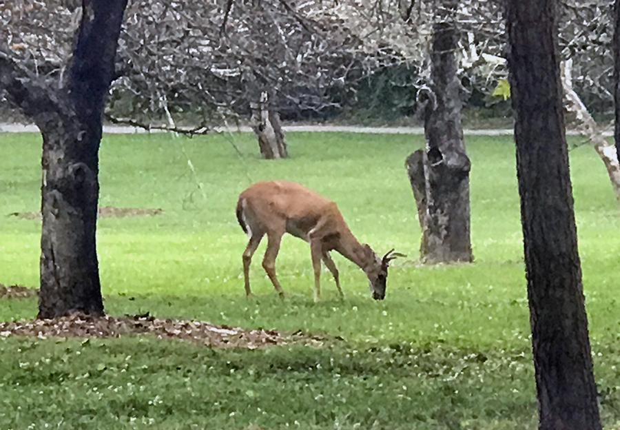 A deer grazes in the orchard | |