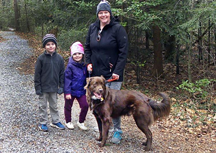 Evan, Courtney, and Lauren Malone walking the trail with their dog, Hal | |