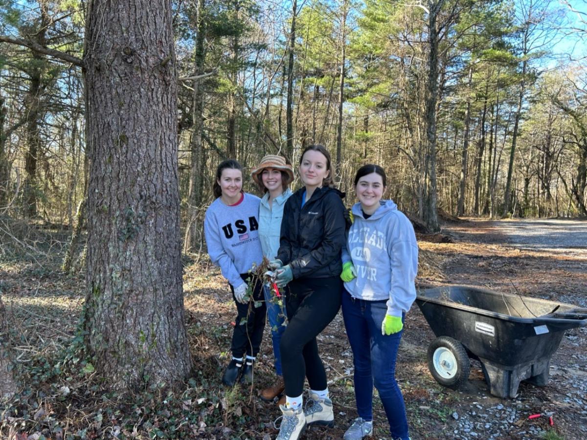 | | Volunteer students Britton Williams, Olivia Plascencia, Katie Laney, and Shannon Hodgen with their cart for hauling away invasive ivy during Weed Wrangle 2023 | |