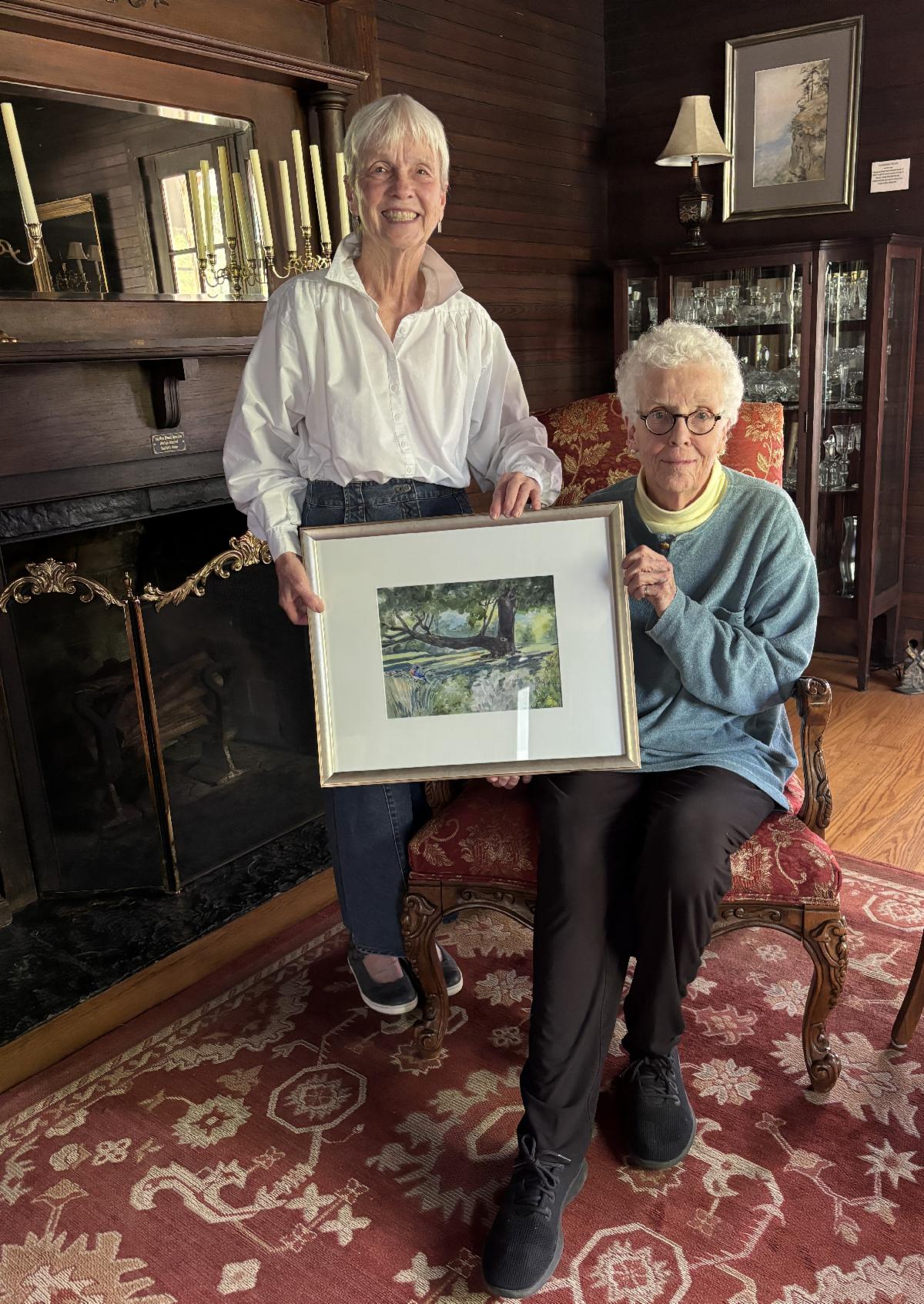 Anne Davis, left, painted McCoy’s beloved Littleleaf Linden for Linda Collins, right, in honor of the first donation made to McCoy’s endowment. | |