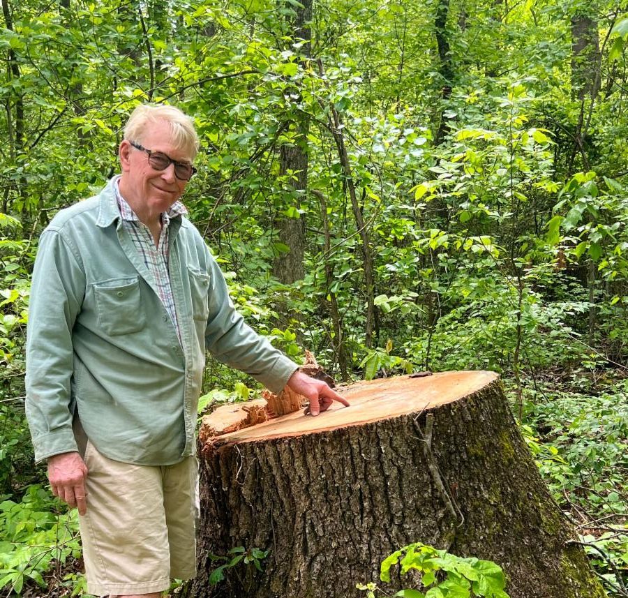 Mickey Robbins counts rings on a tree that fell at McCoy. The rings indicate the tree was growing on the property before the Bachmans arrived in 1911. | |