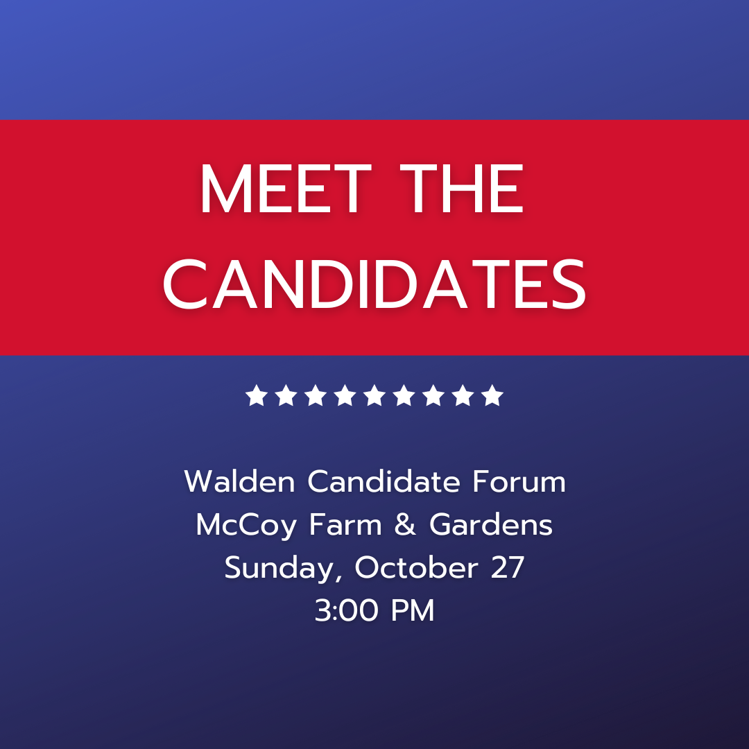 - Mark your calendars for a Candidate Forum to hear Lizzy Schmidt and Lou Ziebold express their views as candidates for a position on the Walden Town Board. The forum will be held at McCoy Farm & Gardens on Sunday, October 27 at 3:00 pm on the front lawn weather permitting, or if not, at the Pavilion.