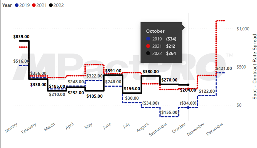 When the price of a truck on the Spot market is more expensive than the contract market, a premium or penalty is paid by shippers for unplanned shipments. It’s not unusual to see the spot market trade at a discount to the contract market as demand for trucks falls; in fact, it is a key indicator that demand for trucks is tanking. The McAllen and Laredo markets make up most shipments, by volume, in the southern cone of Texas. 3PLs who do business in Zone 7, specifically on the border, are accustomed to seeing demand for, and the supply of, trucks become volatile. This is the time of year when 3PLs should be present to the fact that owner operators are going to demand a higher rate, because they know in the months of November, December, and January, there are generally more loads than trucks. It’s predictable.