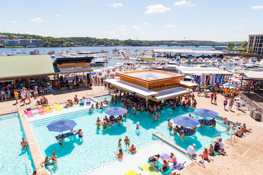 Dog Days Bar & Grill is one of the Lake of the Ozarks' most popular waterside restaurant and features two swimming pools, two music stages and many boat slips for those arriving by water.