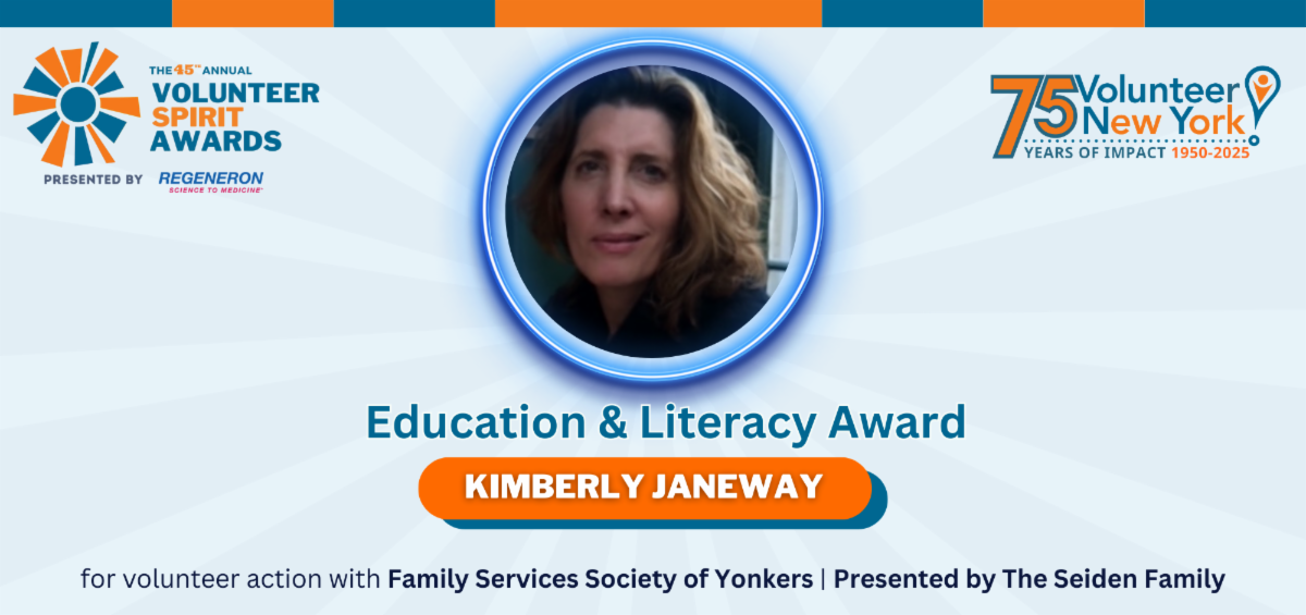 Kimberly Janeway’s life has come full circle. Her journey began with her immigrant grandmother, who made regular trips to the library with her when she was young, insisting that reading would be Kimberly’s “ticket out” of their working-class Pennsylvania town. And she was right. Kimberly attended college at Penn State and later earned a master’s degree in journalism. Today, she carries that same passion for literacy into her volunteer work, providing reading support for students at under-resourced schools through the Family Service Society of Yonkers.