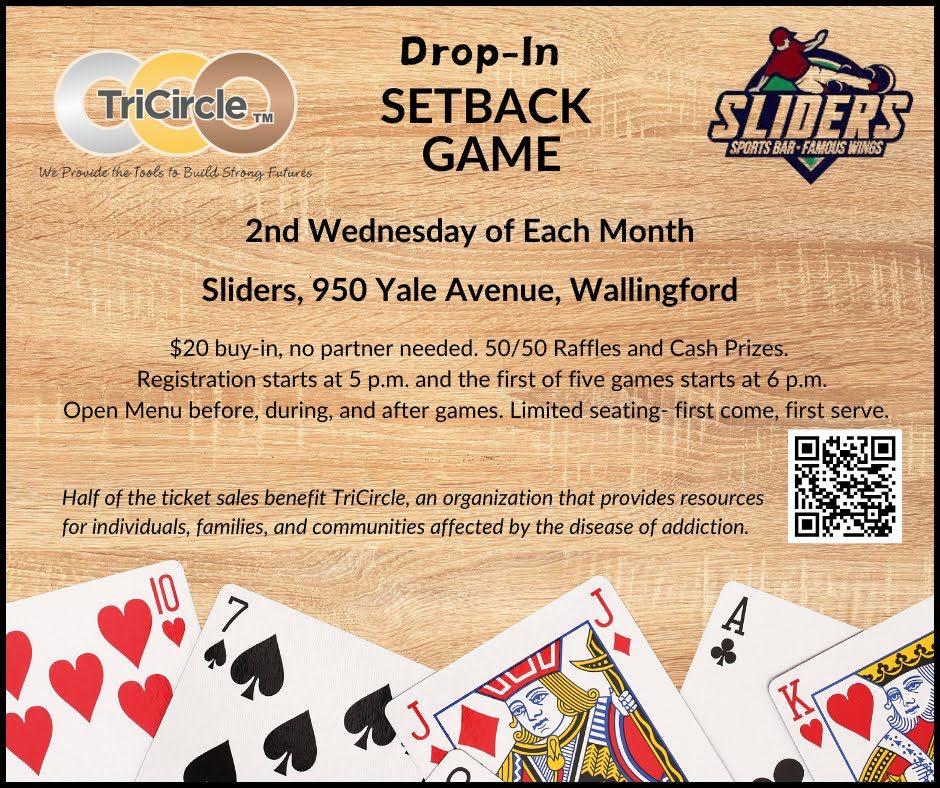 New Location for Drop In Setback! Sliders in Wallingford - Second Wednesday of each month, April 9, at 950 Yale Avenue, Wallingford. Registration at 5:00 pm, first game 6:00 pm. (click here)