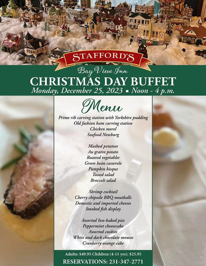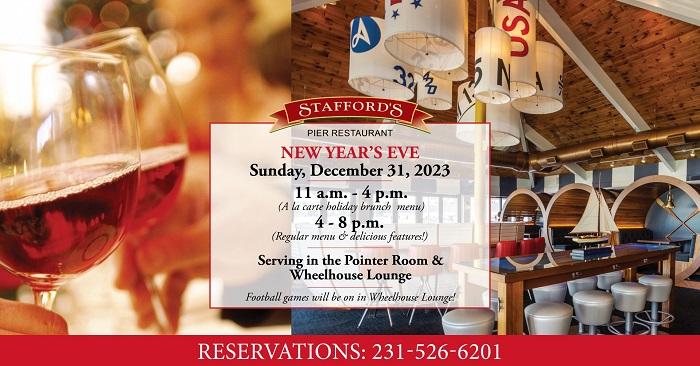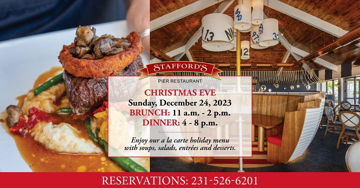 Bring your family to a very special Christmas Eve and/or New Year's Eve celebration in our beautiful corner of northern Michigan. Stafford’s Pier has a great atmosphere to gather families, neighbors, and friends for a special holiday menu prepared for this special occasion. Reservations are required, 231-526-6201. Menu details.