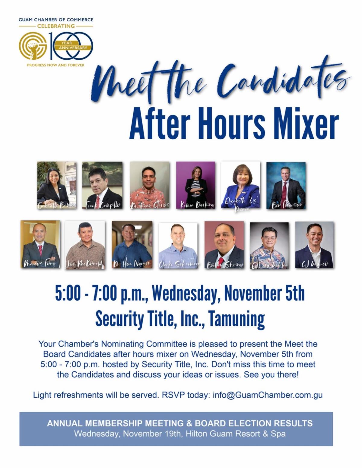 Your Chamber's Nominating Committee is pleased to bring you an opportunity to meet and mingle with the Chamber Board Candidates who are vying for nine available seats on the Chamber Board in 2026. The After Hours Mixer is scheduled for Wednesday, November 5th, at Security Title, Inc., in Tamuning, from 5:00 p.m. - 7:00 p.m.