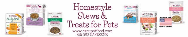 Caru® Pet Food now has a full line of Homestyle Stews & Treats for Dogs and Cats to enjoy. From our Just Like Homemade Classic Stews for Dogs, which come in 6 delectable flavors to our savory Daily Dish Stews for Dogs, which also now come in 6 yummy flavors to our New Classic Stews for Cats (available in 4 flavors), our Bone Broths (in two flavors) for dogs and cats and our Dog & Cat treats; we've got a complete line of meals and treats for your pets to enjoy.
