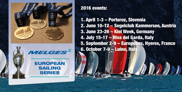 were held to complete the 2016 Melges 24 European Sailing Series: the season opener in Portoroz, Slovenia in April; second event at Attersee, Austria in June; third event during world-famous Kiel Week, Germany in June; fourth event on a popular Garda Lake, Italy in July; Marinepool European Championship in Hyeres, France as the fourth event in September; and the sixth event on Lake Maggiore, Luino, Italy in October.