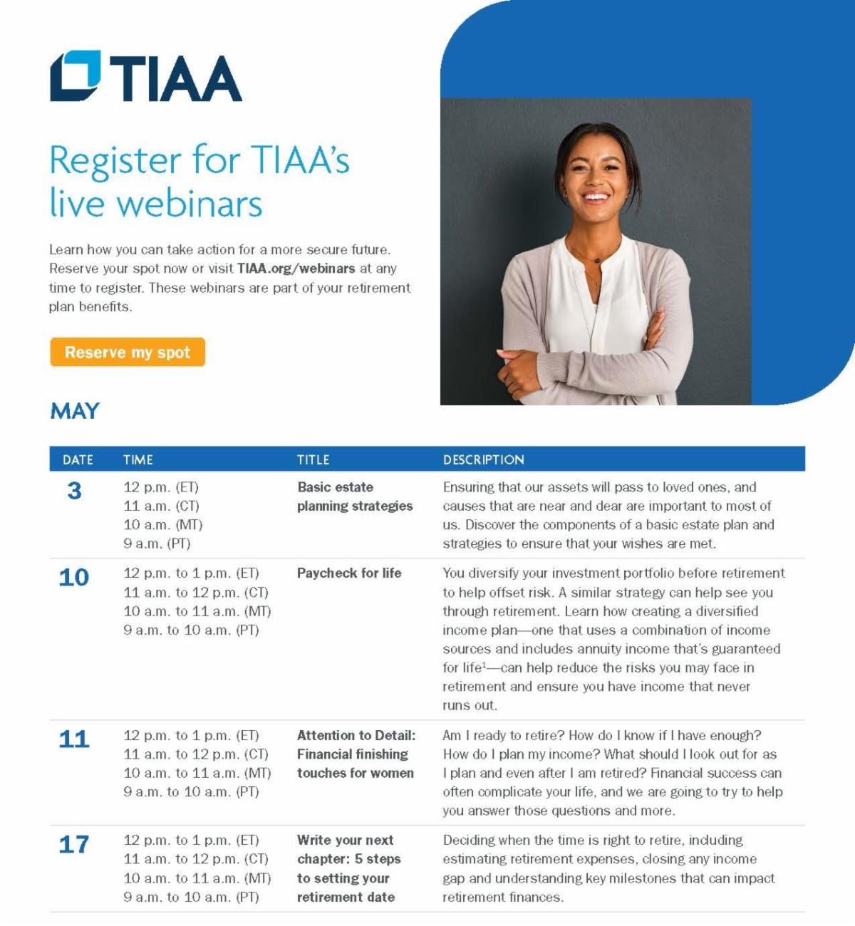 Below is the May calendar of TIAA events and attached are the promotional flyers. These webinars are open to all and available now for registration in the Live Webinar Lounge (www.tiaa.org/webinars). | |