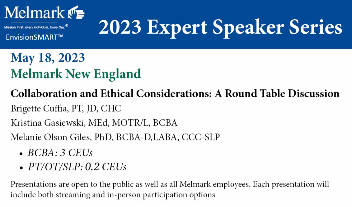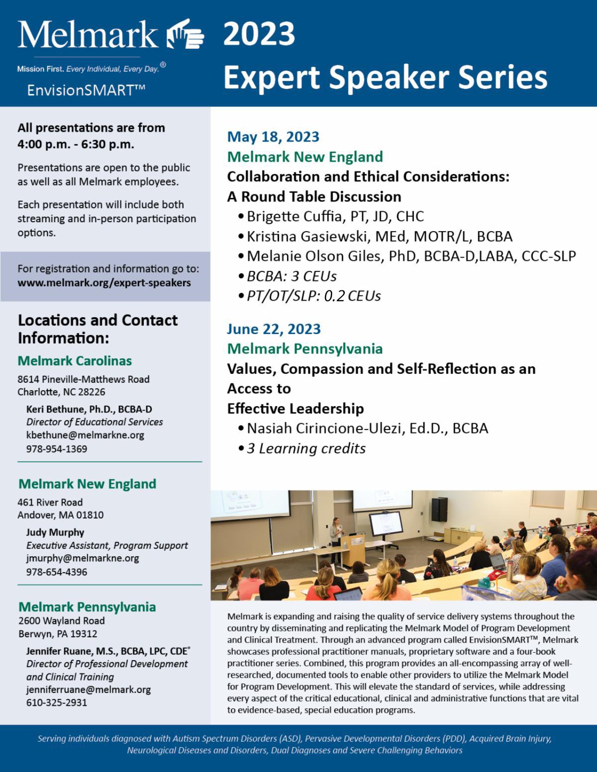 Whether you're a clinician needing BCBA credits, or you're a parent / caretaker wanting to learn more, check out Melmark's Expert Speaker Series. Melmark facilitates the sharing of knowledge regarding clinically sophisticated, evidence-based practices. All events are streamed to Melmark divisions, so you can attend the location nearest you. | Information regarding speakers in the line-up for 2023: | |