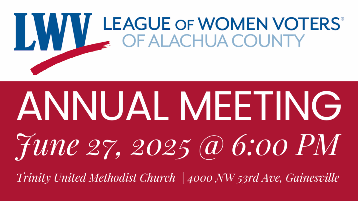 The What You Can Do ad hoc committee is organizing a League group to join the June 14 “No Kings” protest from 10 a.m. – noon. It will be at the traffic circle at South Main and Depot Avenue. Protests are planned nationwide; this is the Alachua County version. We need you! The vision is a large group of League members, dressed in white as a nod to the suffrage movement, with protest signs standing on the pavement at the center of the traffic circle. The League of Women Voters banner will be prominent. We’ll be noisy and make good trouble, as the League has always done!