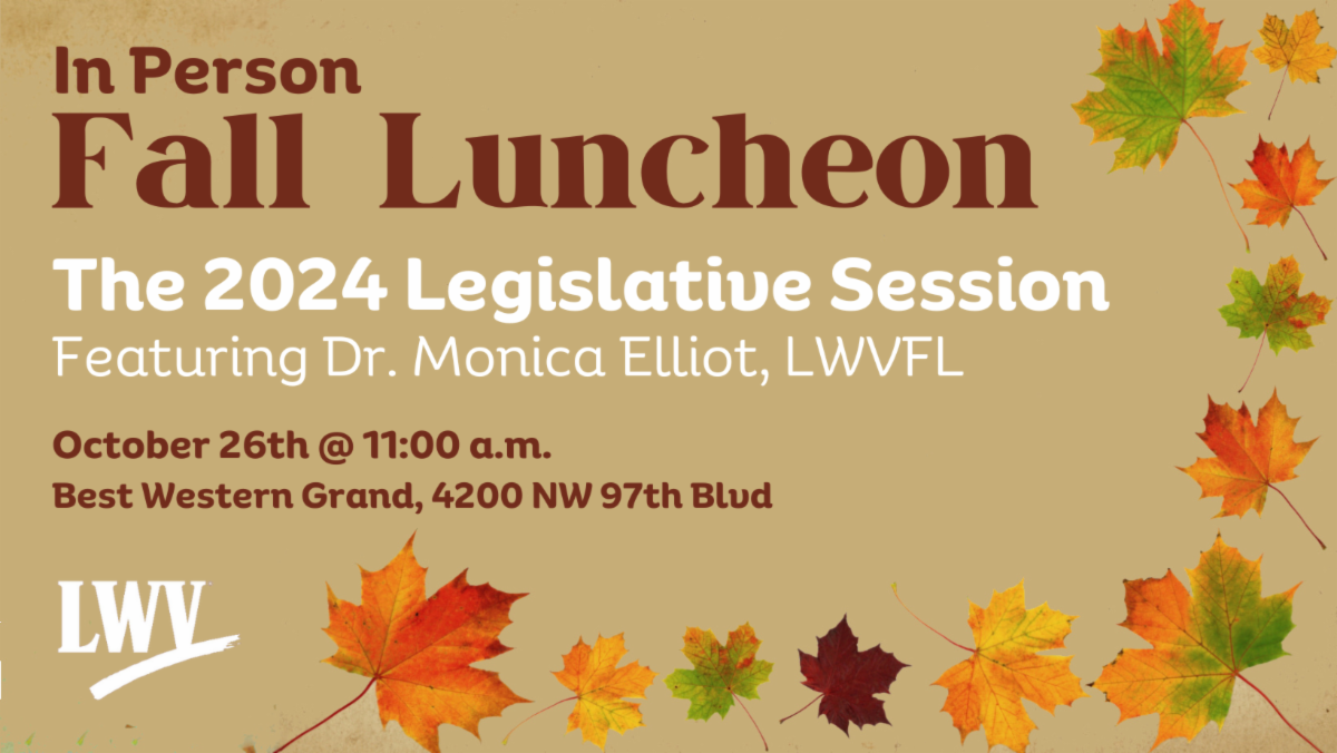 Reservations have closed for the LWVAC Fall Luncheon but if you RSVP'd, we look forward to seeing you there and hearing what Dr. Monica Elliot, LWVFL Secretary and Voter Services Chair and LWV of Broward County Co-President and Voter Services Chair, has to say about expectations for the 2024 Florida Legislative Session.
