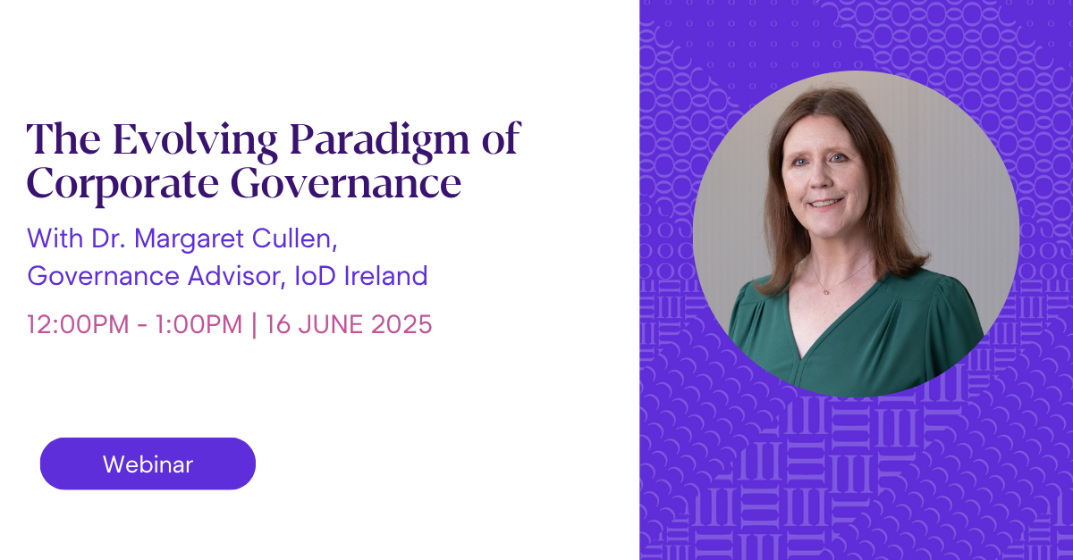 Book your place on our upcoming webinar with Dr. Margaret Cullen, Governance Advisor, IoD Ireland. Margaret will explore the evolution of corporate governance as a paradigm and provides insights into the significant changes influencing boards and their organisations.