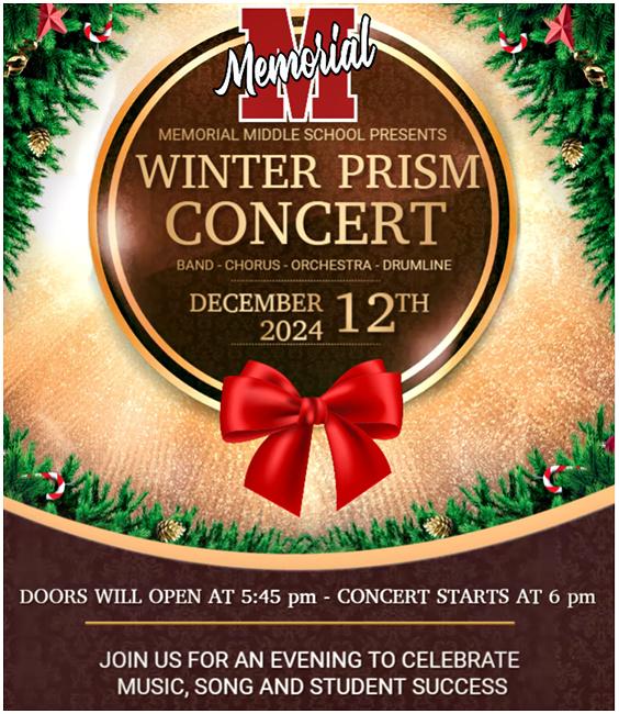 Please join us on December 12th from 6-7 pm in our school gym for our Winter Prism Concert. Doors to the school will open at 5:45pm, so please make arrangements as we will not allow any families in earlier than 5:45pm. It is suggested to arrive early as this is a VERY POPULAR event. | | |