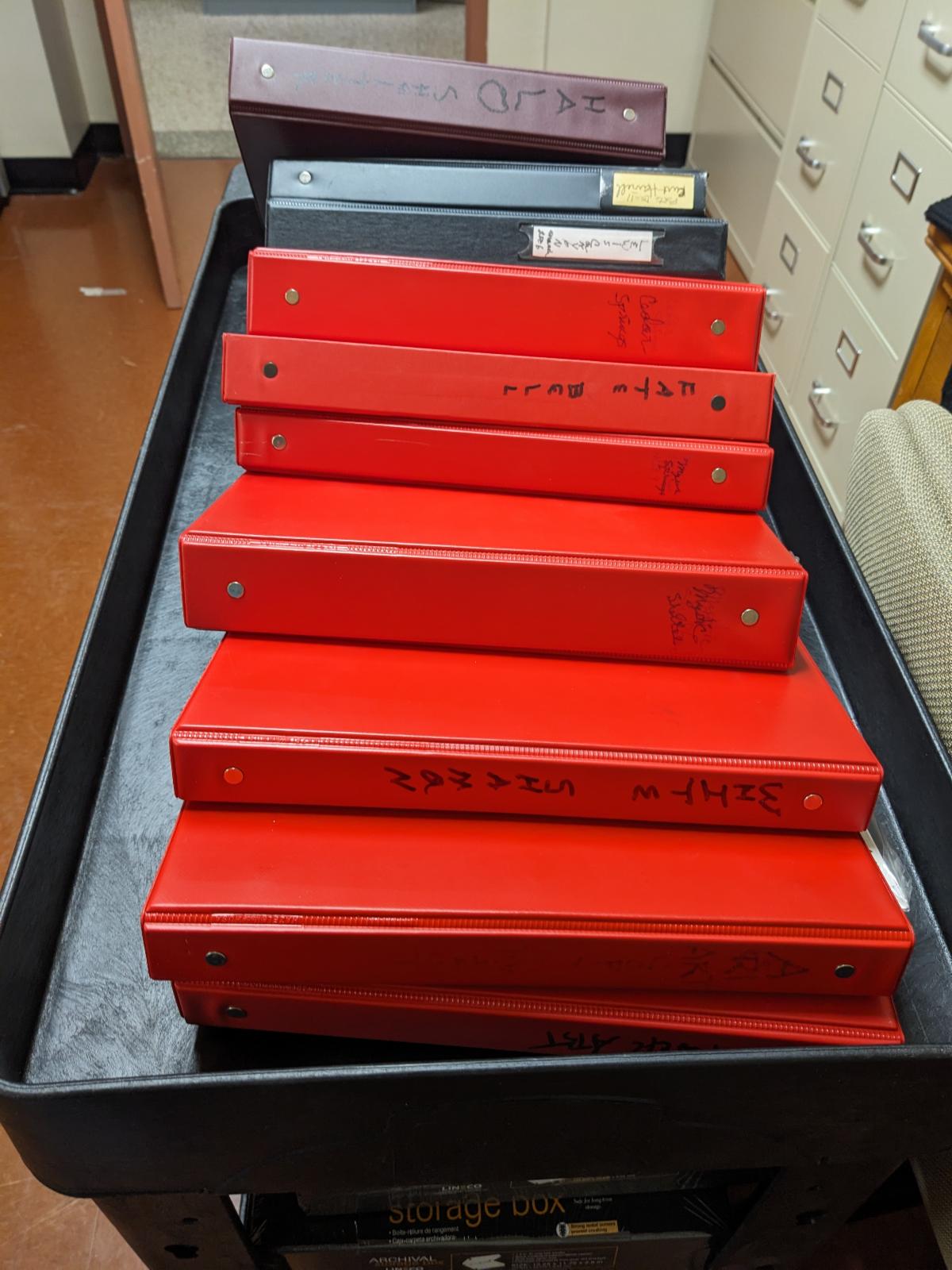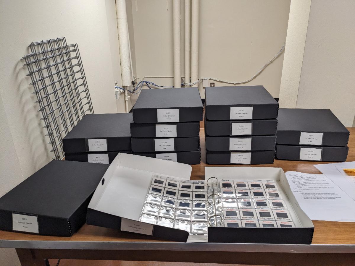 On the left are binders full of legacy slides of key rock art sites. On the right you can see them properly organized and protected in archival boxes.