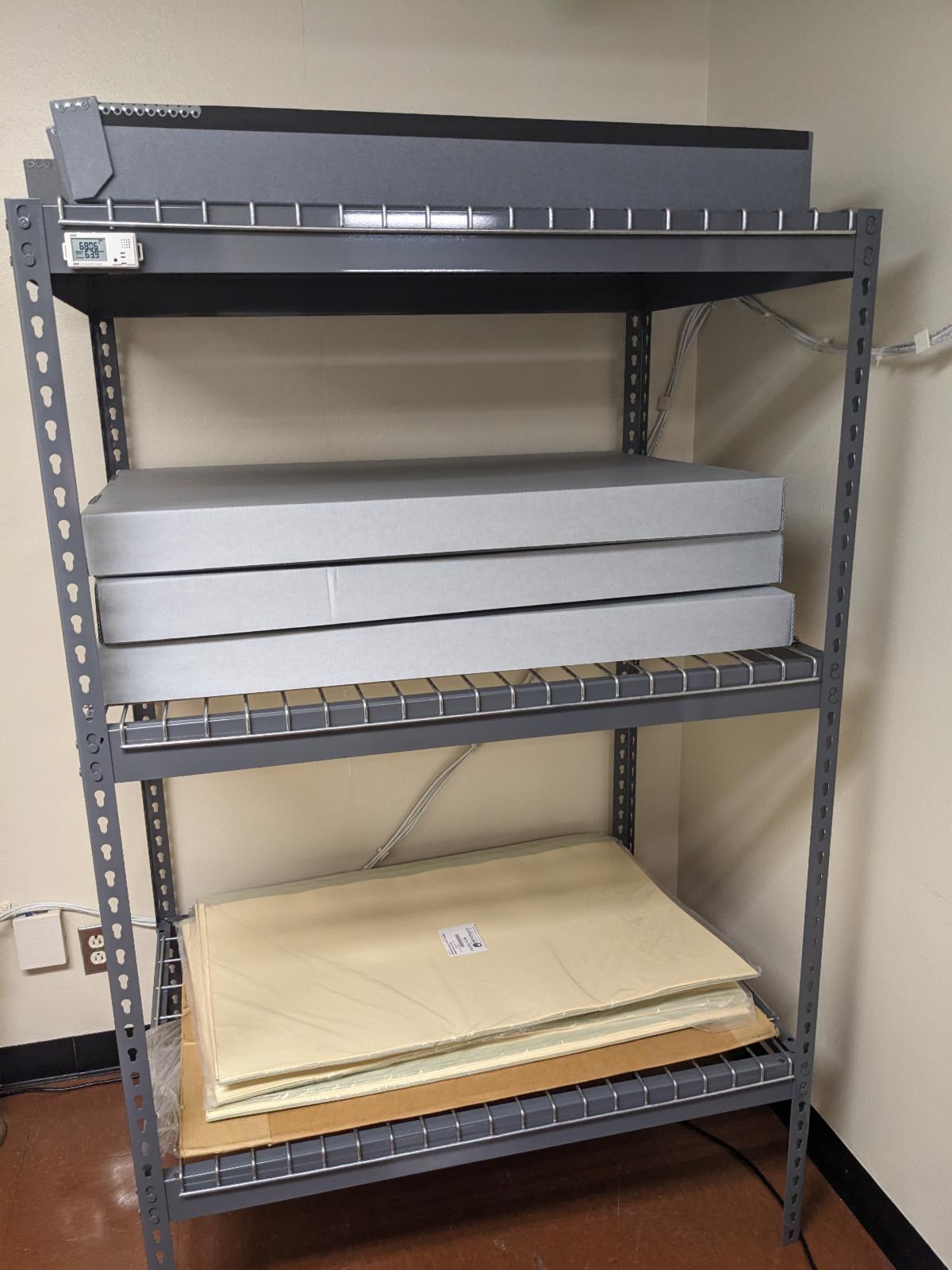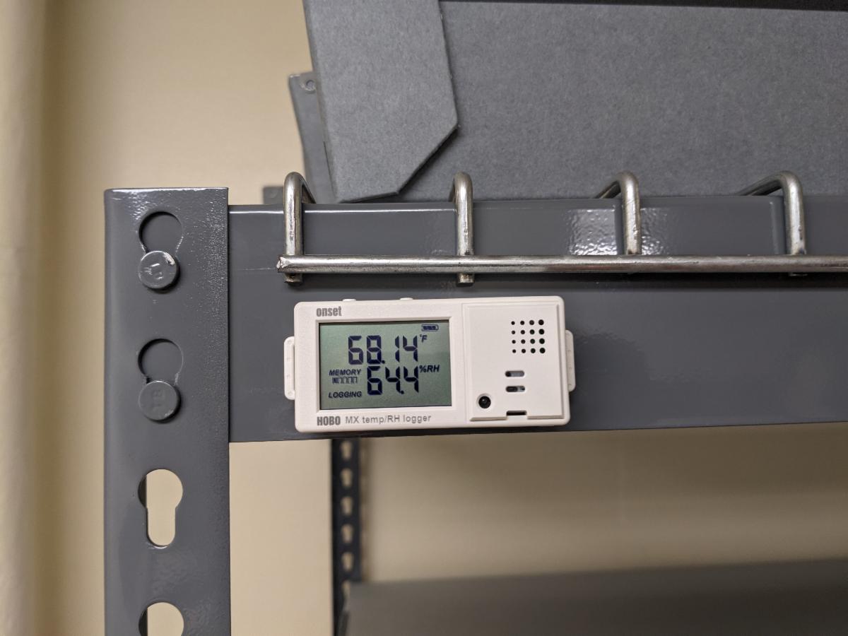 A recent grant from the Texas Historical Foundation helped us purchase this data logger to track the environmental conditions in our space, shown mounted at the top left of our new shelving unit.