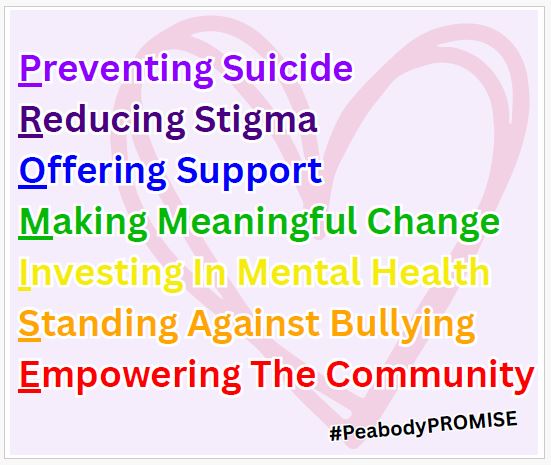 Hello, As you may know, The City of Peabody has launched Peabody PROMISE, a dedicated website and community task force focused on mental health, anti-bullying initiatives, and suicide prevention. Peabody PROMISE aims to strengthen the support systems and resources available to our community. We're eager to share the progress we’ve made and invite you to join us at the Higgins Middle School auditorium on Monday, December 1st, at 6pm for a community update. All members of the community are welcome and no registration is required. Following the community update, parents and caregivers are encouraged to attend "When To Worry," a free Mental Health Workshop upstairs in the Higgins library at 6:30m. Registration for "When to Worry" is required as space is limited. Register here https://form.jotform.com/252396029449163