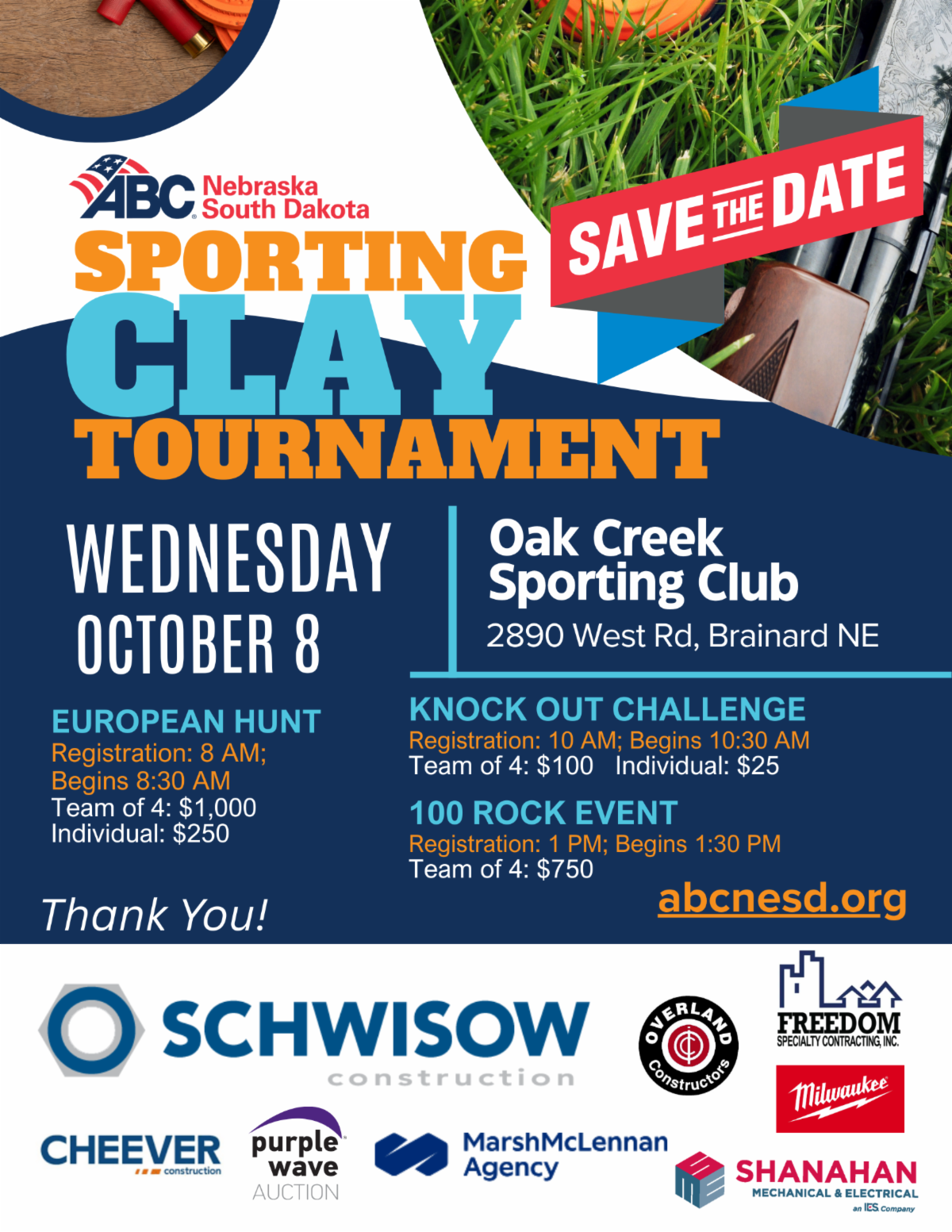 Join us for the 2025 Sporting Clays Tournament at Oak Creek Sporting Club in Brainard, NE. Sponsorship opportunities available!