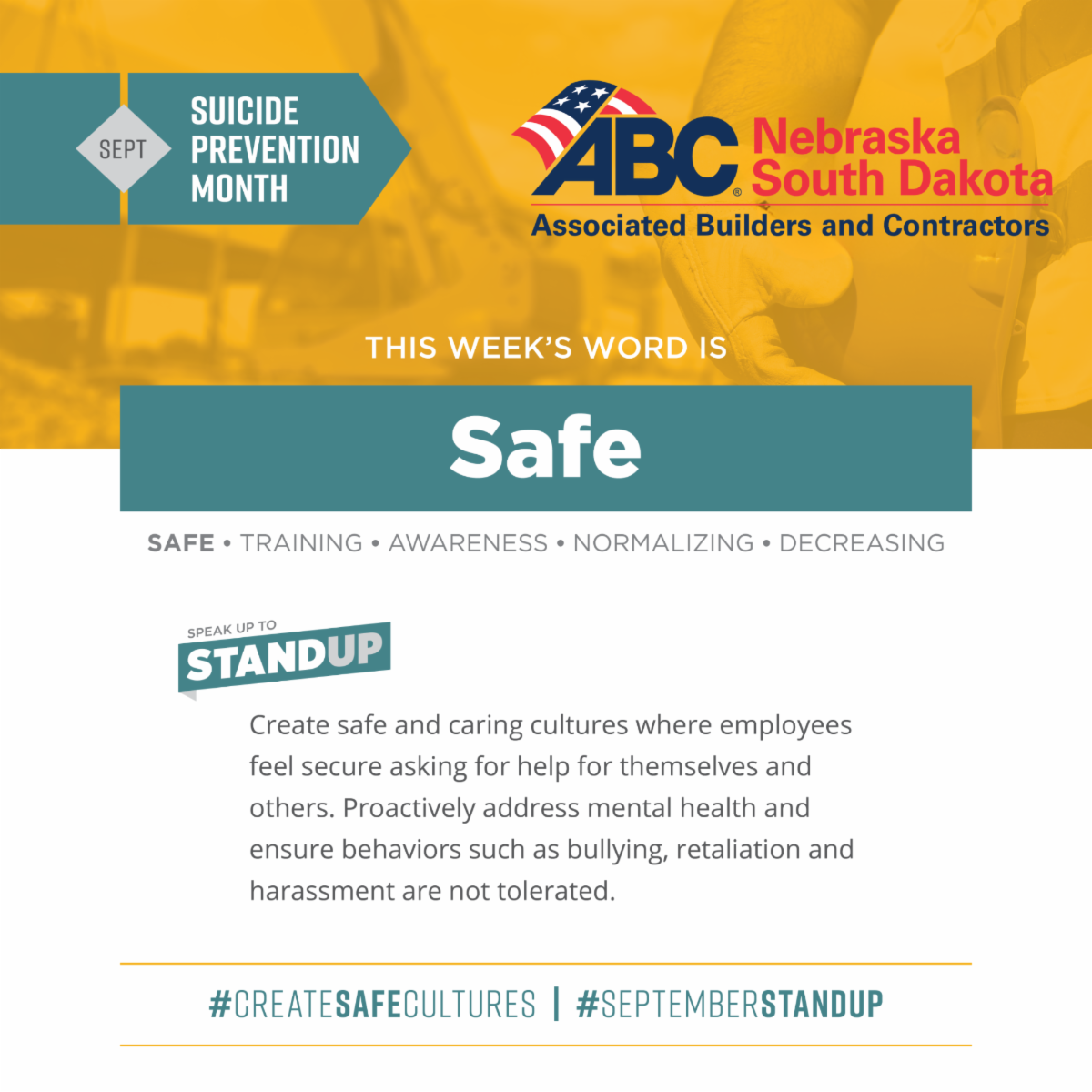 September is Suicide Prevention Month, and ABC stands up for safe and caring cultures across the industry. Weekly resources, toolbox talks, and CIASP’s #SeptemberStandUp campaign are here to help you start the conversation.