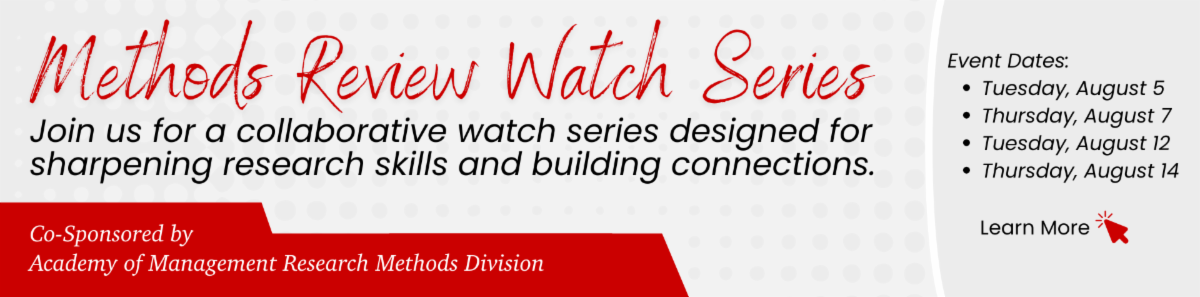 CARMA is excited to announce the return of our Methods Review Watch Series! The Watch Series is co-sponsored by the Academy of Management Research Methods Division and is designed to help doctoral students and researchers review key topics in research methods, especially useful for those preparing for comprehensive exams or looking for a refresher before the new semester kicks off.