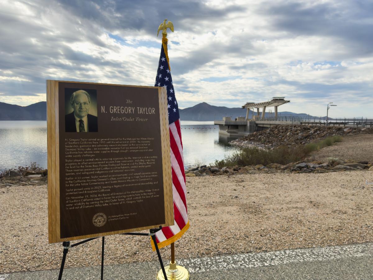 During the Oct. 9 ceremony at DVL, Metropolitan named the 270-foot Inlet/Outlet Tower for Taylor, who served as Metropolitan's general counsel from 1993 until his retirement in 2000. During that time, Taylor played a central role in securing the necessary approvals for the reservoir’s construction, ensuring Southern California has reliable water supplies through drought, emergencies and other challenges. The tower controls the flow of water into and out of the reservoir.