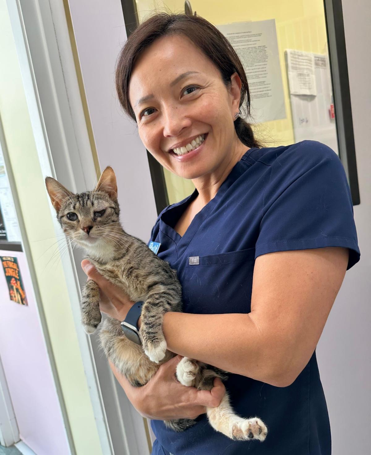 Moon's left eye is so severely damaged that she has lost her vision in it and it must be surgically removed. Her right eye, though scarred, still shows some residual signs of vision. Dr. Liu is hopeful that with diligent care, we might be able to save it. We’re doing everything we can to get her healthy and pain-free again.