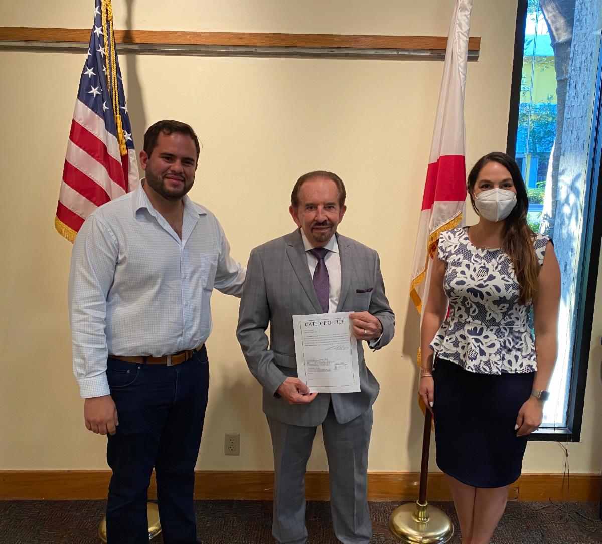 HAAB Chairperson Jose Diaz and Program Director Natalie Milian swear in board member Armando Rodriguez, appointed by Commissioner Raquel Regalado, District 7.