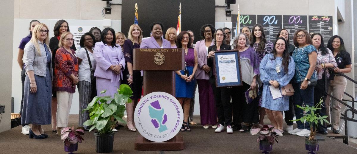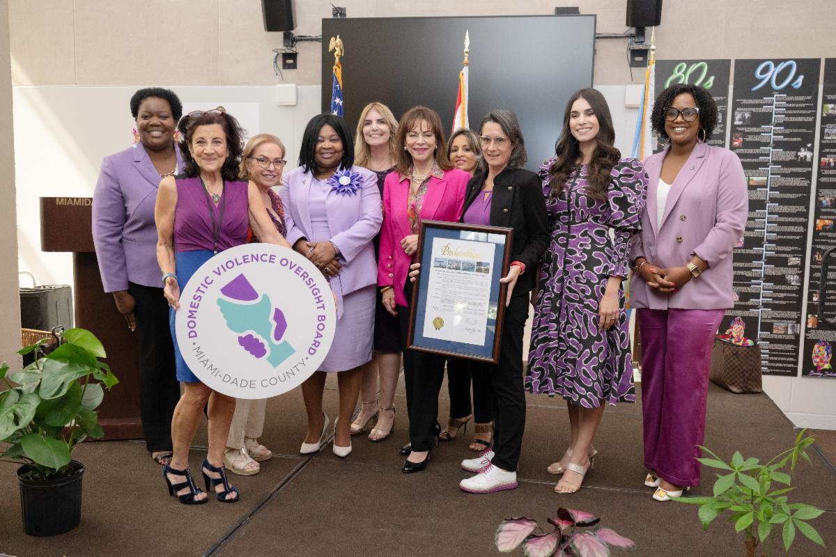 The Miami-Dade County Domestic Violence Oversight Board (DVOB) and the Miami-Dade County Community Action and Human Services Department (CAHSD) kicked off National Domestic Violence Awareness Month on October 2 in the lobby of the Stephen P. Clark Center. Miami-Dade State Attorney Katherine Fernandez Rundle offered remarks and shared resources, legal insights, and statistics with attendees. Chief Community Services Officer Cathy Burgos presented a proclamation on behalf of Mayor Daniella Levine Cava and the Miami-Dade Board of County Commissioners. Several municipalities have also honored the DVOB with proclamations throughout the month, including Coral Gables, North Miami Beach, West Miami, Doral, Miami Beach, and Medley.