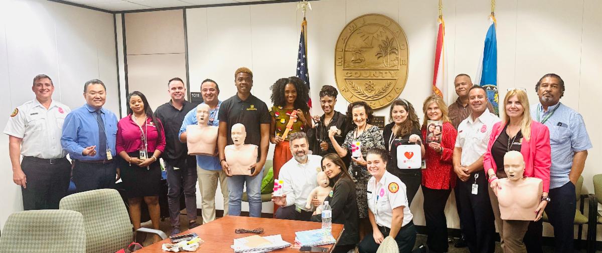 | On October 29 the Office of Community Advocacy participated in the Help Emergency Life Protection (HELP) training course, equipping staff with critical skills to better serve and protect our community. This intensive two-hour training, provided by Miami-Dade Fire Rescue (MDFR), covered essential lifesaving techniques to recognize and address common life-threatening emergencies. Through interactive lectures and hands-on skills practice, we learned how to respond in situations involving adult and pediatric hands-only CPR, AED (defibrillator) operation, early stroke recognition, stopping the bleed, and blocked airway emergencies for all ages. In the process we met some of the terrific men and women of MDFR who work tirelessly to keep us safe. We are grateful for their service. | |