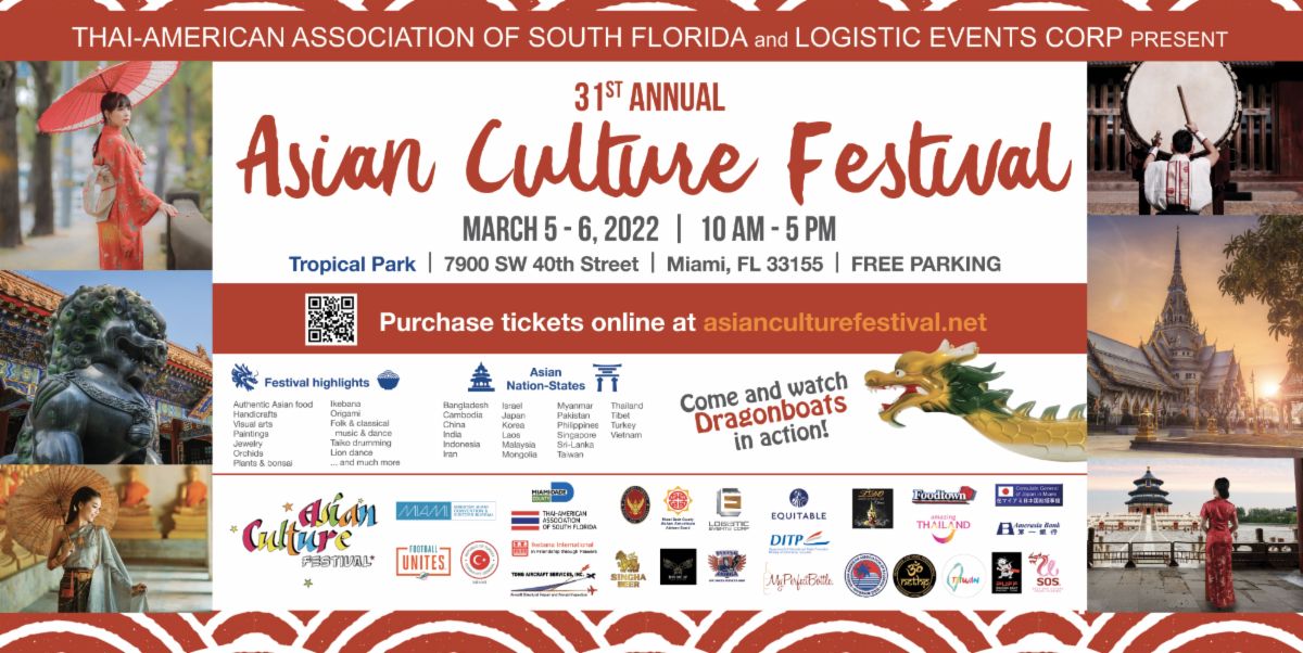 We are back! The 31st Annual Asian Culture Festival will be held at beautiful Tropical Park in Miami on Saturday, March 5th and Sunday, March 6th from 10am to 5pm. The Asian Culture Festival promotes the importance of cultural diversity in building a vibrant, prosperous and healthy community. For ticket information, please go on www.asianculturefestival.net. Hope to see you all there!