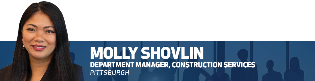 has joined Michael Baker’s Pittsburgh Office as Department Manager in the Construction Services Practice. She brings more than 23 years of industry experience across a broad range of construction areas; including commercial specialty contracting, heavy highway and bridge construction, and building and industrial claims analysis. In her new role, Molly will be leading the pursuit of vertical construction services in the region. Most recently, Molly worked on numerous consulting projects involving delay claims, cost claims, property damage estimates, and other construction-related disputes. Recent projects have included high-profile work such as hurricane damage to One World Trade Center, construction disputes on Seattle’s SR 99 Alaskan Way Bored Tunnel, and overflow of the King County Sewage Treatment Facility. Molly is a member of the Construction Management Association of America.
