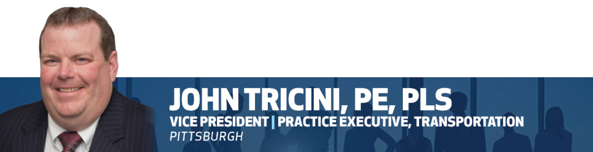 , has been promoted to Vice President and Pittsburgh Transportation Practice Executive. John solidifies leadership in the Pittsburgh Office with his 26 years of industry experience, all at Michael Baker, and where he most recently served as the acting Transportation Practice Executive. As Practice Executive, John provides overall leadership to the group while managing the financials, operational performance, practice administration, production/project oversight, business development, and client engagement for our Highway, Traffic, Aviation and Emerging Technology services. John has a Master of Business Administration degree from Duquesne University in Pittsburgh, Pennsylvania, and a Bachelor of Science degree in Civil Engineering from the Pennsylvania State University in State College, Pennsylvania. He is a registered Professional Engineer and Professional Land Surveyor in Pennsylvania. John also serves on the Board of Directors of ASHE's Pittsburgh Chapter.