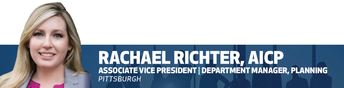 , has been promoted to Associate Vice President and Planning Department Manager. In this role, Rachael will lead the Pittsburgh Planning Department—inclusive of Federal, municipal, hazard mitigation and comprehensive planning—by focusing on growing the core markets and introducing new markets and clients, while ensuring that our technical capabilities and quality standards align. Rachael has 13 years of extensive experience, including 10 at Michael Baker, as well as Department of Defense master planning, local community planning and outreach and meeting facilitation. Rachael holds a Master of Urban and Regional Planning degree from Florida Atlantic University in Boca Raton, Florida, and a Bachelor of Arts degree in Political Science from the University of Florida in Gainesville. Rachael is a certified Planner and a LEED Green Associate.