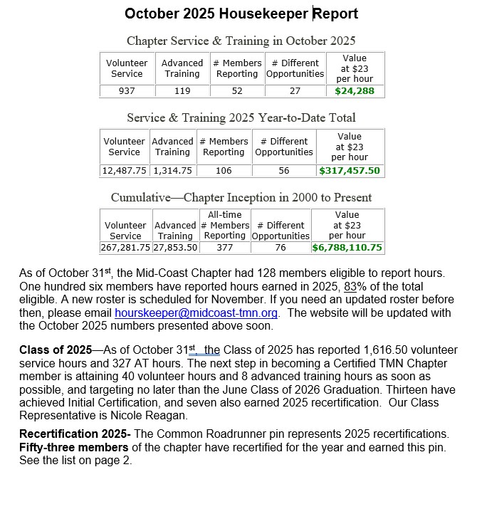By Steve Ferguson, President, Mid-Coast Chapter TMN